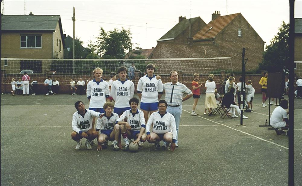 volleybalploeg van Radio Benelux op het terrein van de jongensschool in Paal. De medewerkers van de lokale radio engageerden zich altijd al in het lokale verenigingsleven door deel te nemen aan verschillende activiteiten in Beringen.