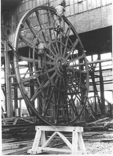 belangrijkste installaties van een steenkoolmijn zijn de schachten en bijhorende schachtbokken. Langs hier daalden de mijnwerkers af naar de ondergrond, kwam de kool naar boven en werd al het materiaal vervoerd. In 1950 wordt een nieuw schachtwiel in schachtbok 2 gemonteerd. Kijk naar de 2 mannen die aan het wiel aan het werk zijn en je hebt een idee van de diameter van zo een schachtwiel".