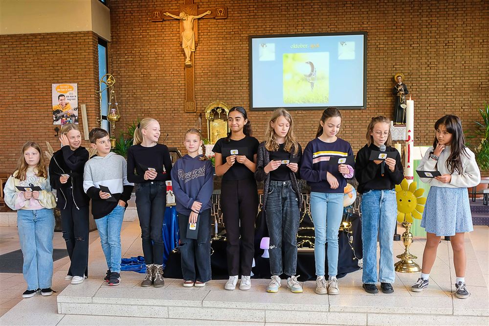 parochiekerk van Stal. Het was ook fijn voor de kinderen om een aantal ouders en grootouders te mogen verwelkomen. Juf Anita zorgde voor teksten en attributen. Deken Thieu ging voor in de viering. "Voor het altaar zagen we allerlei lichtbronnen staan: een vuurtoren, een lichtbak, een lantaarn, een nachtlampje, een verlichte wereldbol, een kaars en uiteraard ook de paaskaars. Dit alles om aan te geven hoe belangrijk licht wel is in ons leven. In de lezingen hoorden we hoe de figuur van Maria, lichtpunt was voor Jezus en dus ook voor ons. De kinderen werden zoveel mogelijk betrokken in de viering: bij de gebeden, de offergave en de gekozen liederen die mooi aansloten bij het thema van de viering"