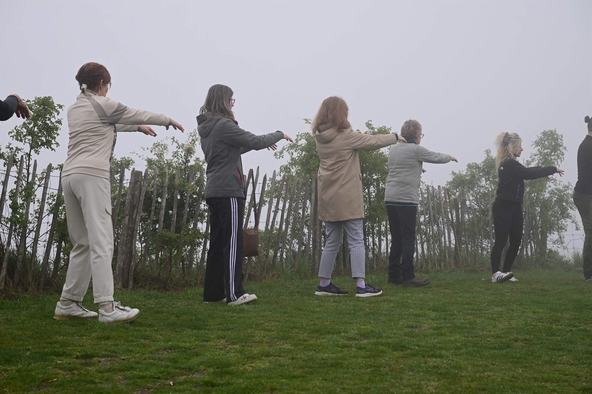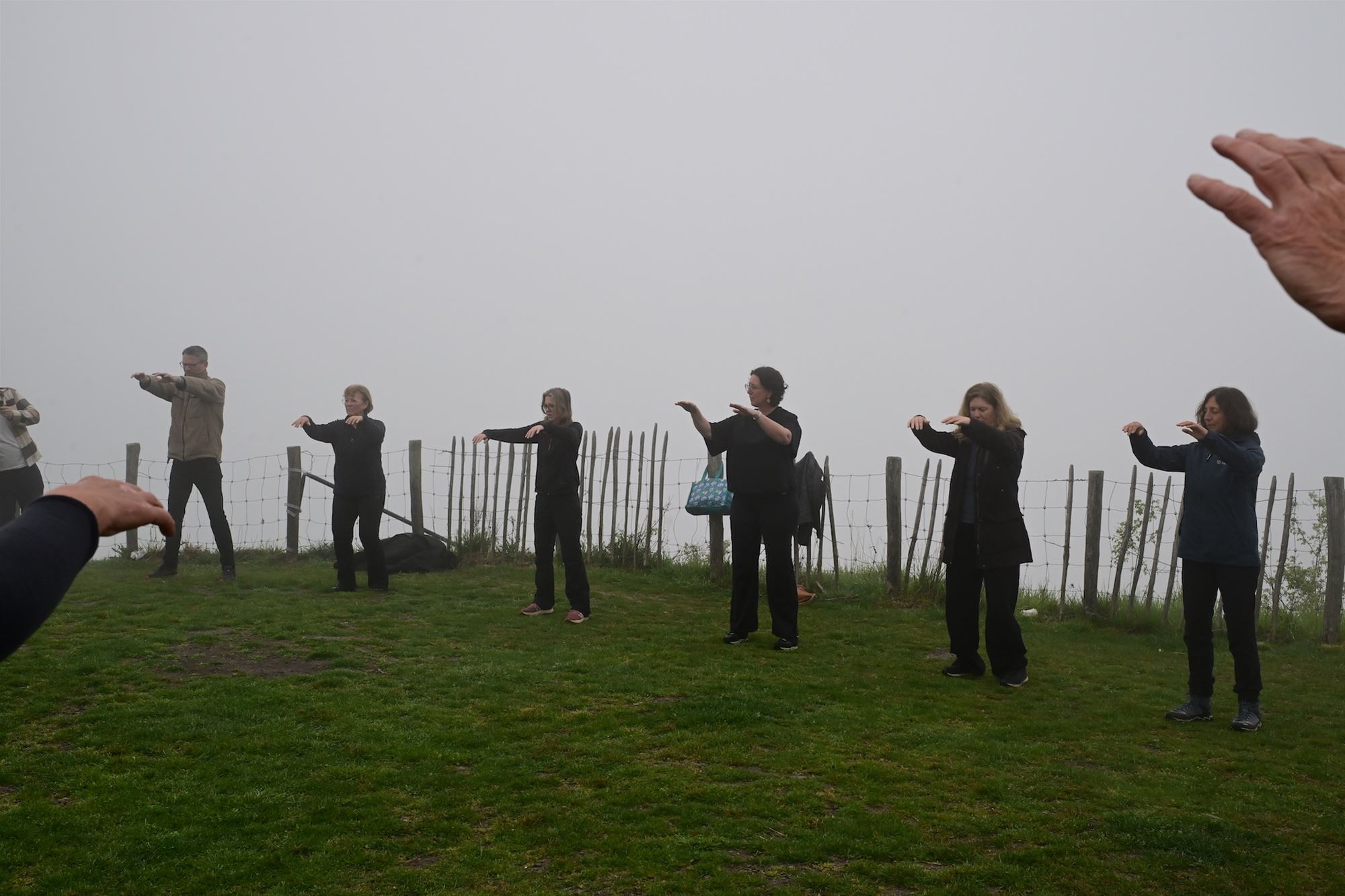 mijnterril van Beringen op. Na een wandeling deden ze daar een reeks tai chi oefeningen. De zon was niet van de partij maar de mist hulde het geheel in een speciale sfeer. Ze maakten daarmee deel uit van de wave, die op hetzelfde moment over zowat heel de wereld werd gevormd door tai chi beoefenaars. Alsof er één groot zen-moment over de aardbol waaide …