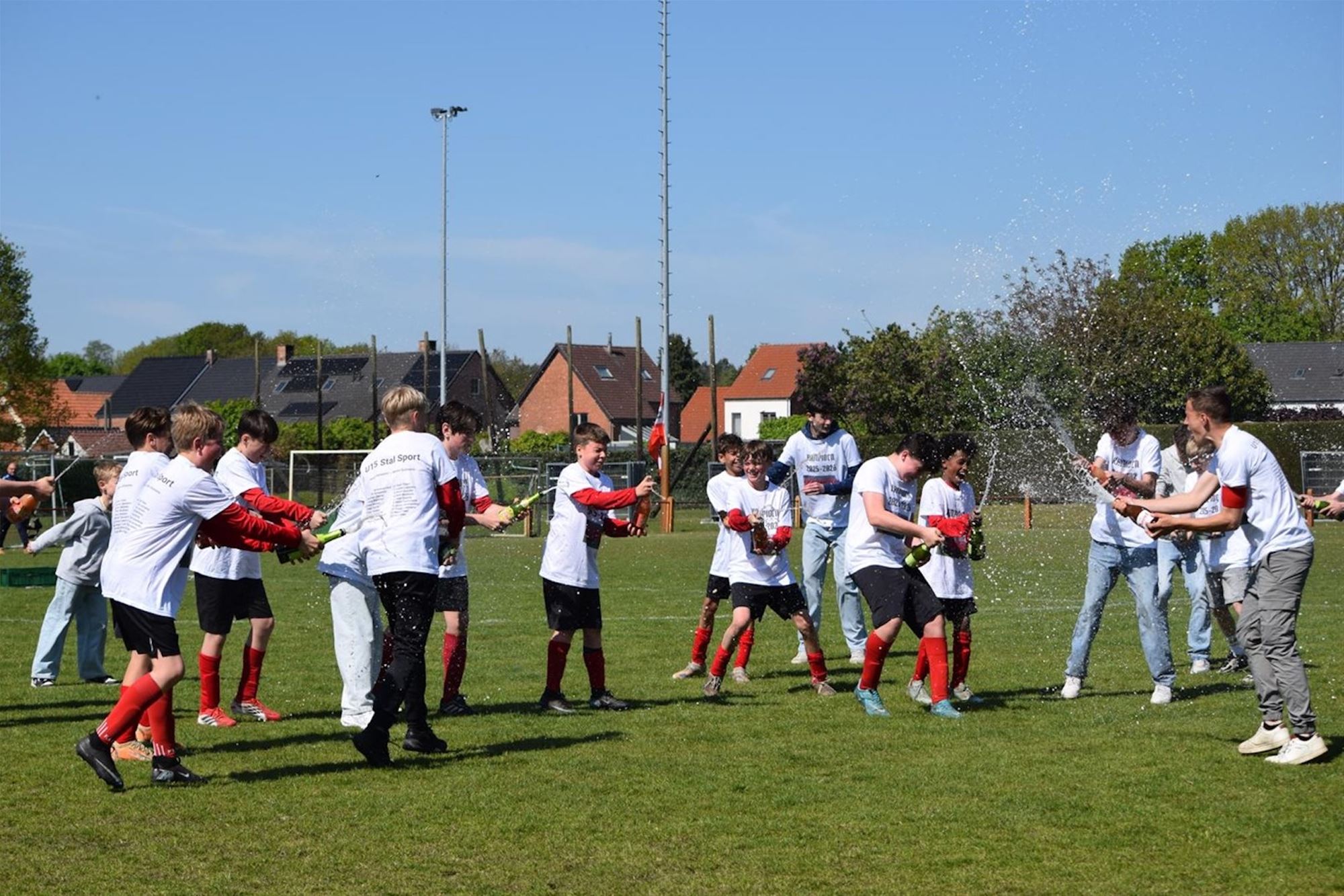U15 Stal Sport kampioen! Met 37 punten op 42 beleefden zij een topseizoen. Er waren heel wat spannende matchen waarbij ze tot het einde hebben moeten vechten voor de overwinning. Dat maakt de ontlading achteraf eens zo groot! Ze hebben dit seizoen heel wat doorzettingsvermogen, veerkracht en teamspirit getoond. Ook de supporters moesten niet onderdoen. Deze groep ouders was altijd massaal aanwezig zowel bij thuis- als uitmatchen om de ploeg te steunen. Afgelopen zondag werd de kroon op het werk gezet met een 4-1 overwinning tegen Verbroedering Balen. Er werd nadien dan ook uitbundig gevierd. De spelers en ouders werden door het bestuur van Stal Sport getrakteerd op lekkere frietjes. (foto's
