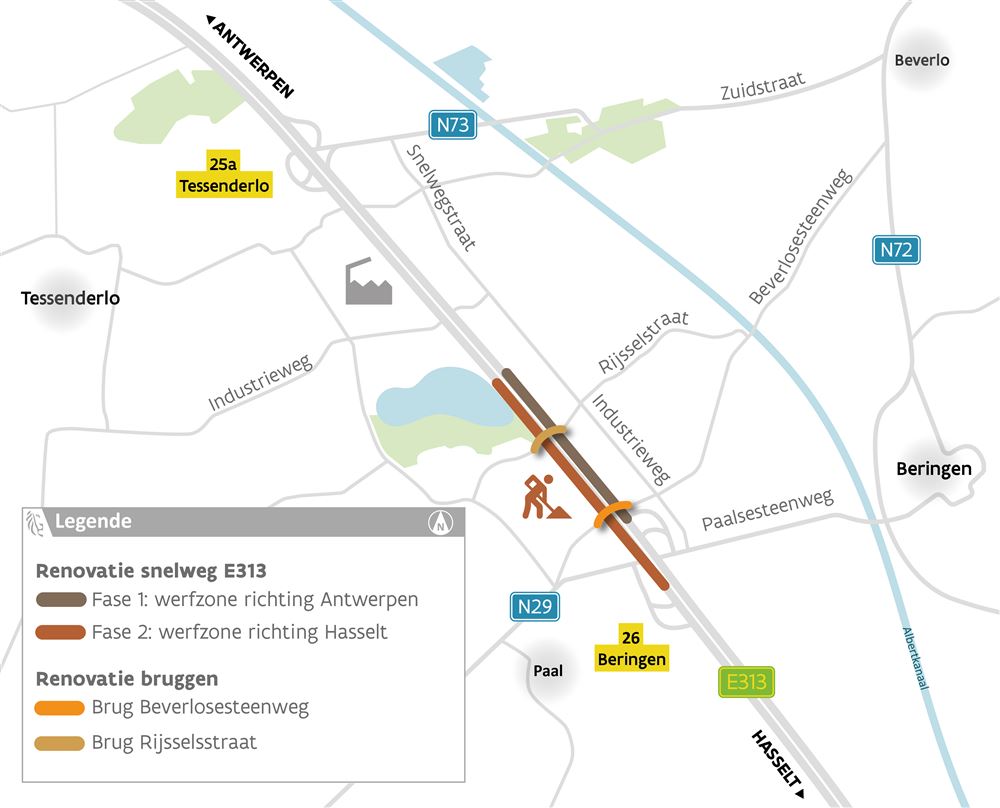 Per fase worden de op- en afritten van het complex 26 Beringen om de beurt voor 1,5 maand afgesloten. Er loopt telkens een omleiding via complex 25a Tessenderlo.