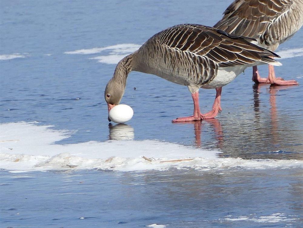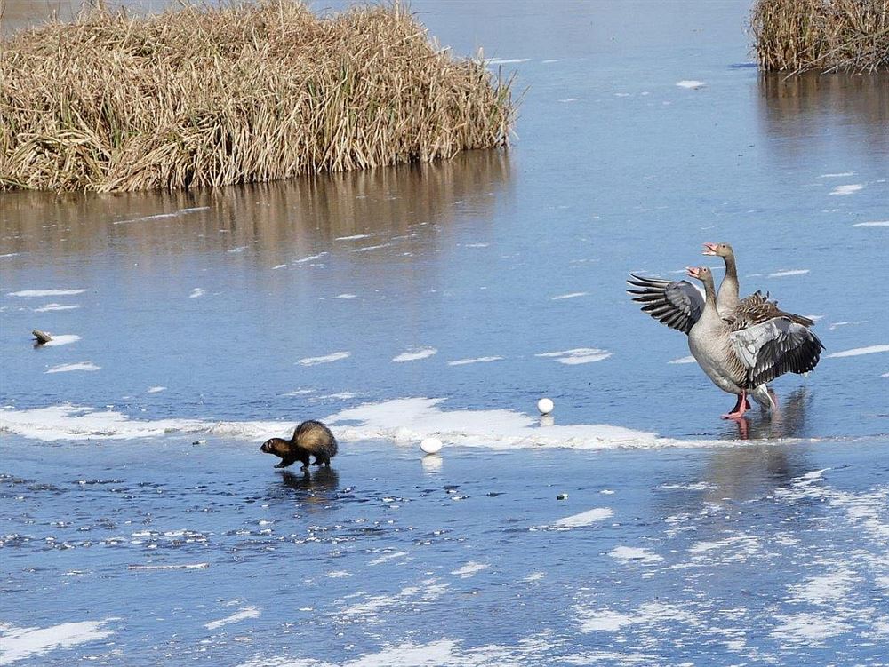 bunzing twee van hun eieren had gestolen. Hij had die op het ijs gelegd. Toen de ganzen dat zagen bleven ze bij de eieren waken, zodat de bunzing er niet meer bij kon. De bunzing trok zich even terug en bleef meer dan 40 minuten in het riet zitten, in de hoop dat de ganzen zouden verdwijnen. Maar dat deden ze niet.