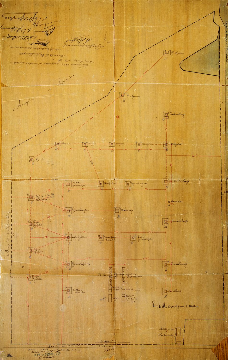 Het toverwoord voor de nieuwe vestiging was: ruimte! Op het ongeveer 200 hectare grote terrein zouden alle gebouwen op een respectabele afstand (zie de rode cijfers op het plan) ingeplant worden.
