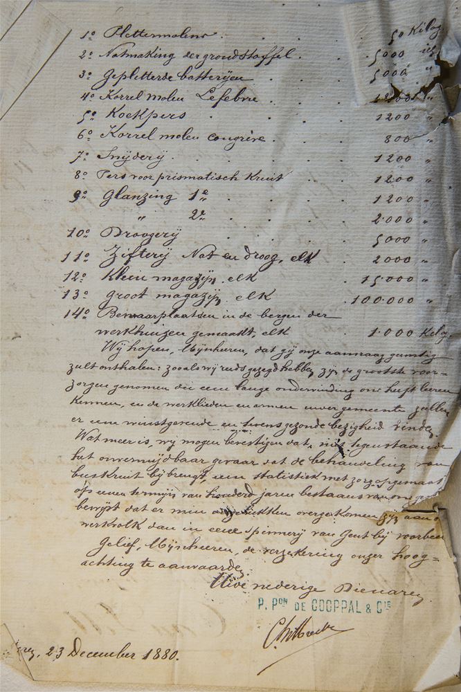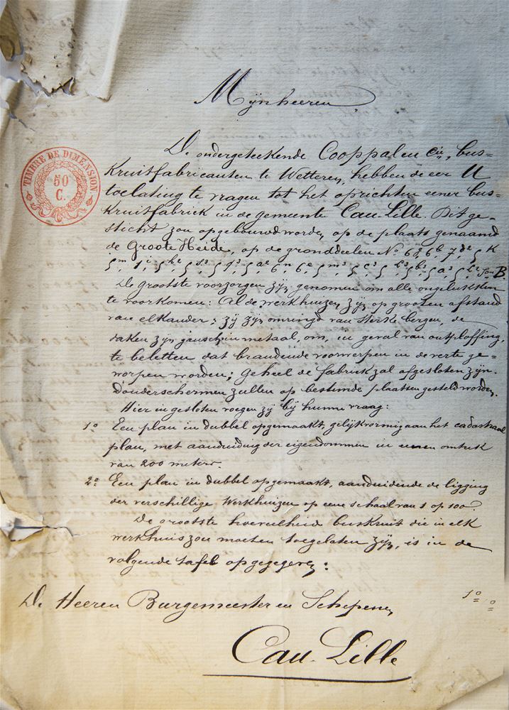 21 december 1880, werd het bovenstaande plan op Cooppal in Wetteren samen met de onderstaande brief naar het gemeentebestuur van Kaulille gestuurd. De brief bevatte het verzoek aan het gemeentebestuur om op de Grote Heide, links van de weg naar Lozen, een buskruitfabriek te mogen oprichten. Brief en plan zouden vanaf dan de evolutie en de geschiedenis van Kaulille mee bepalen. Een bijdrage van Jef Vanbussel: