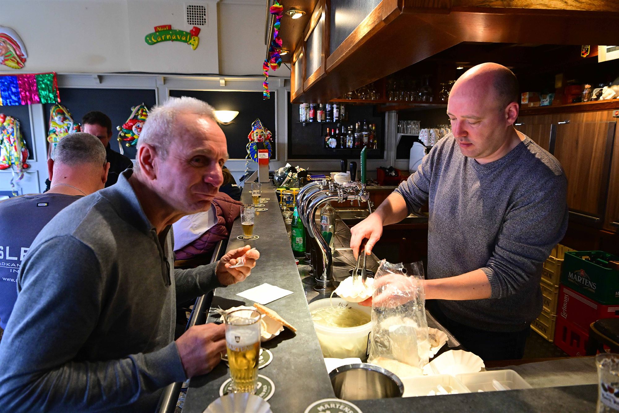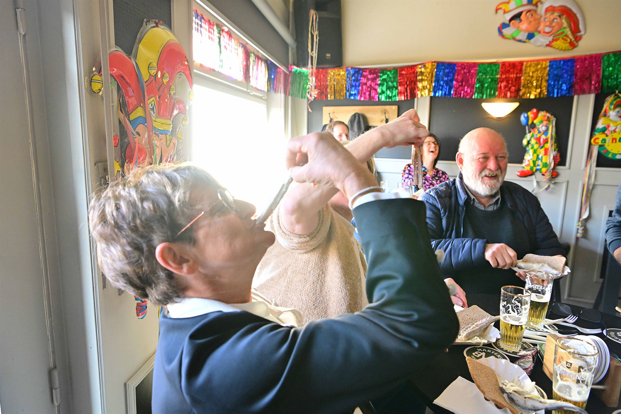 Boggeter Papbugels van afgelopen maandag. En ze sluiten bij de carnavalsvereniging 'hun jaar' af met een andere traditie: met een Martens pils en vooral... met een vettige pekelharing!