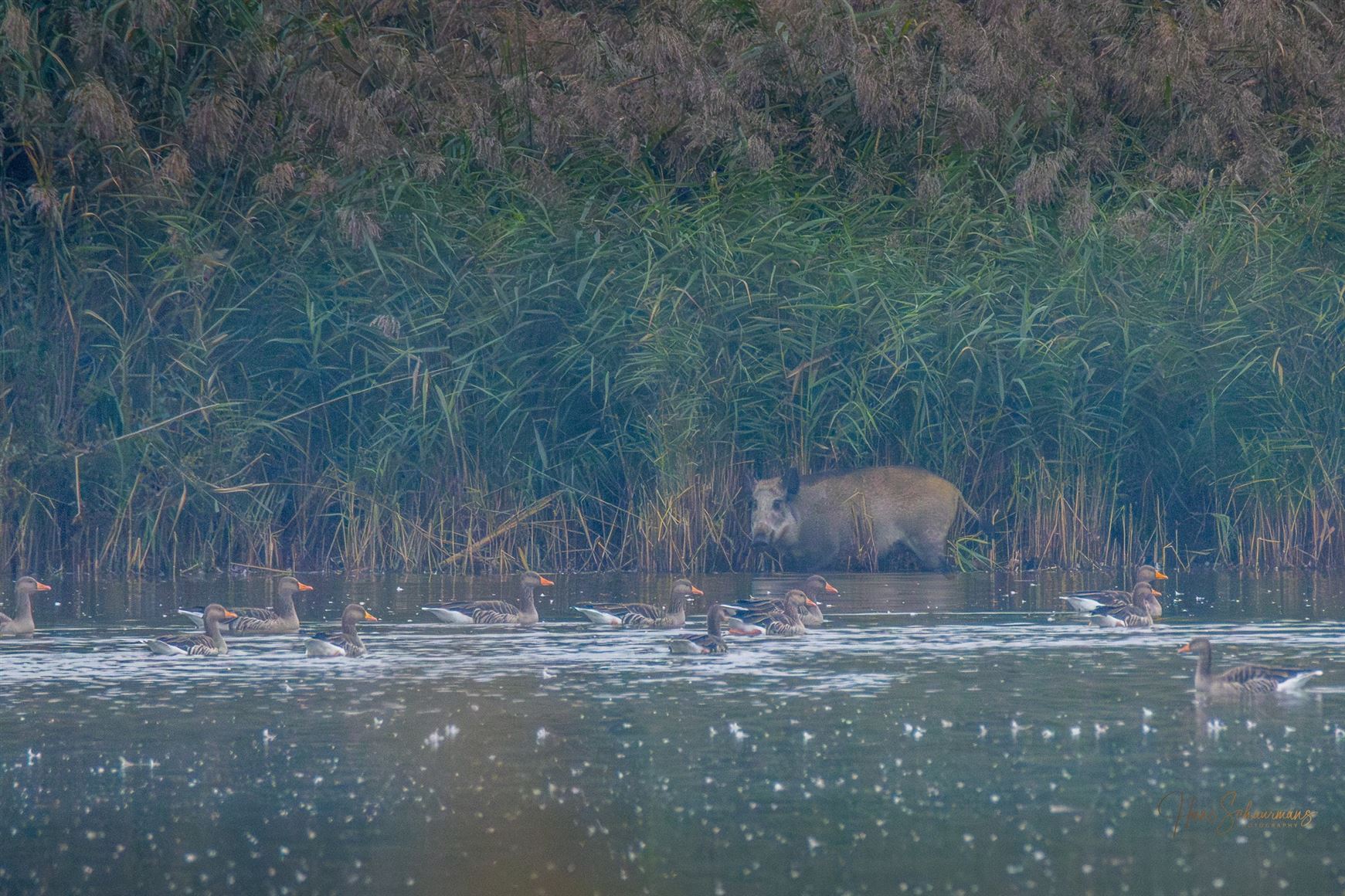 De Luysen. Terwijl een groep nietsvermoedende eenden rustig op het water dobbert, loert vanuit het riet een everzwijn toe. Hongerige blik of gewoon nieuwsgierig? De natuur blijft verrassend!