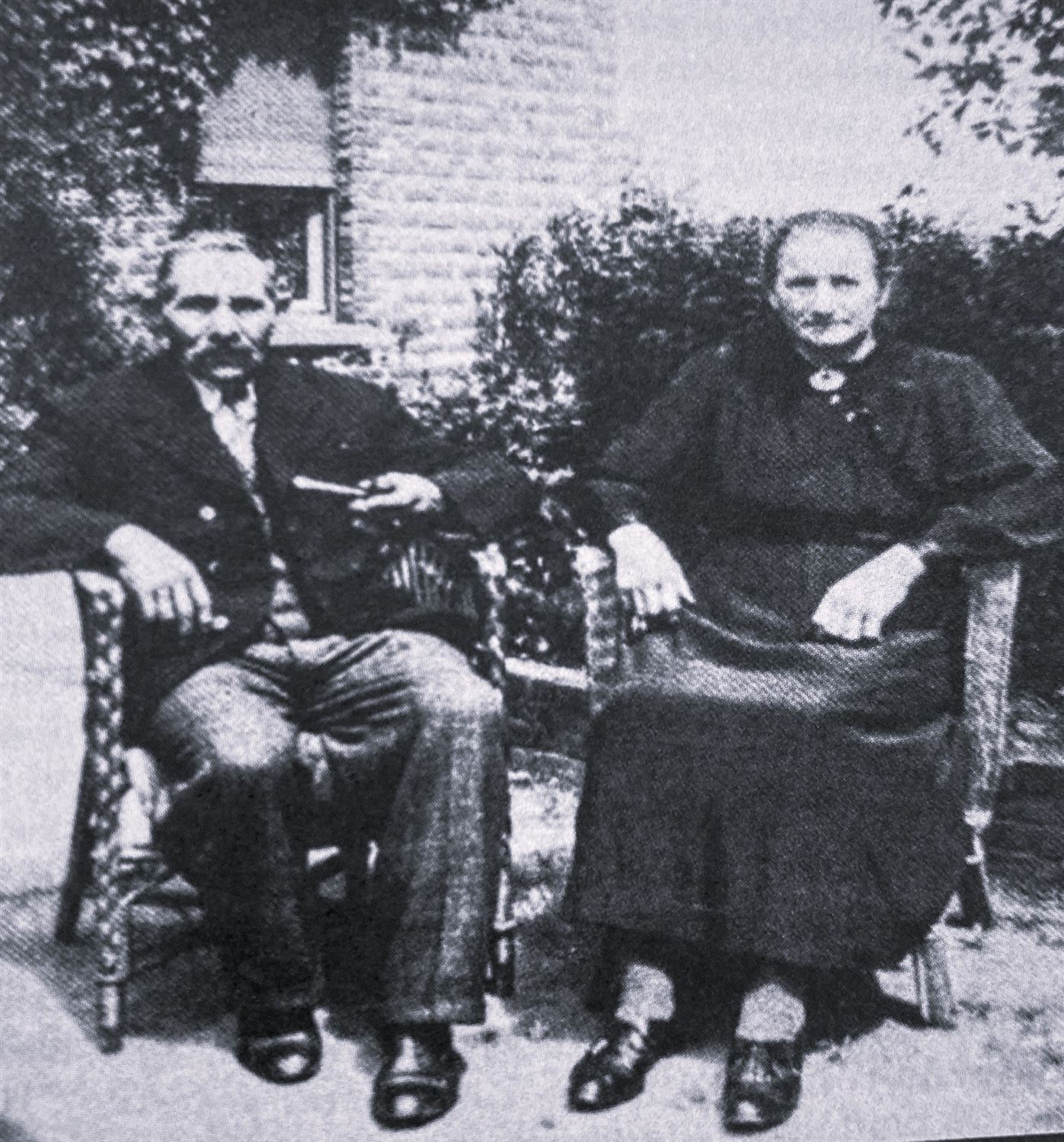 Jules Sleurs en Gertrude Smeets, in een zonnig hoekje achter hun boerderij. Die lag op Elshoven, op het verste stukje van de Kauliller Winterdijk — net niet Kleine-Brogel, evenmin al Grote-Brogel. Toen omstreeks 2000 het einde van de Tweede Wereldoorlog werd ‘gevierd’, zei hun zoon Nand: “Mijn ouders hadden ze moeten decoreren in plaats van zovelen die behangen zijn met medailles. Alle dagen hebben zij hun leven geriskeerd. Zij verdienden het, maar over hen wordt niks gezegd.”