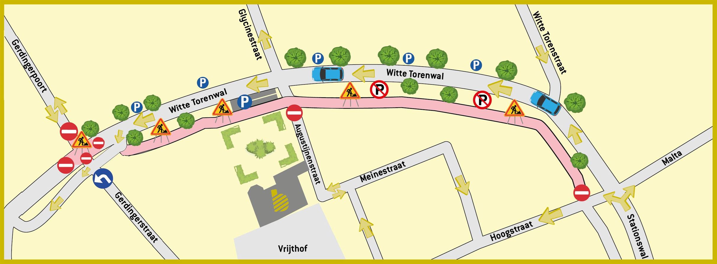 Voor voetgangers blijft er tijdens de werken steeds een doorgang voorzien langs de werfzone. Fietsers kunnen ervoor kiezen om af te stappen en te voet door de werfzone te gaan, of een omleiding te volgen via de Opitterpoort en de Hoogstraat.