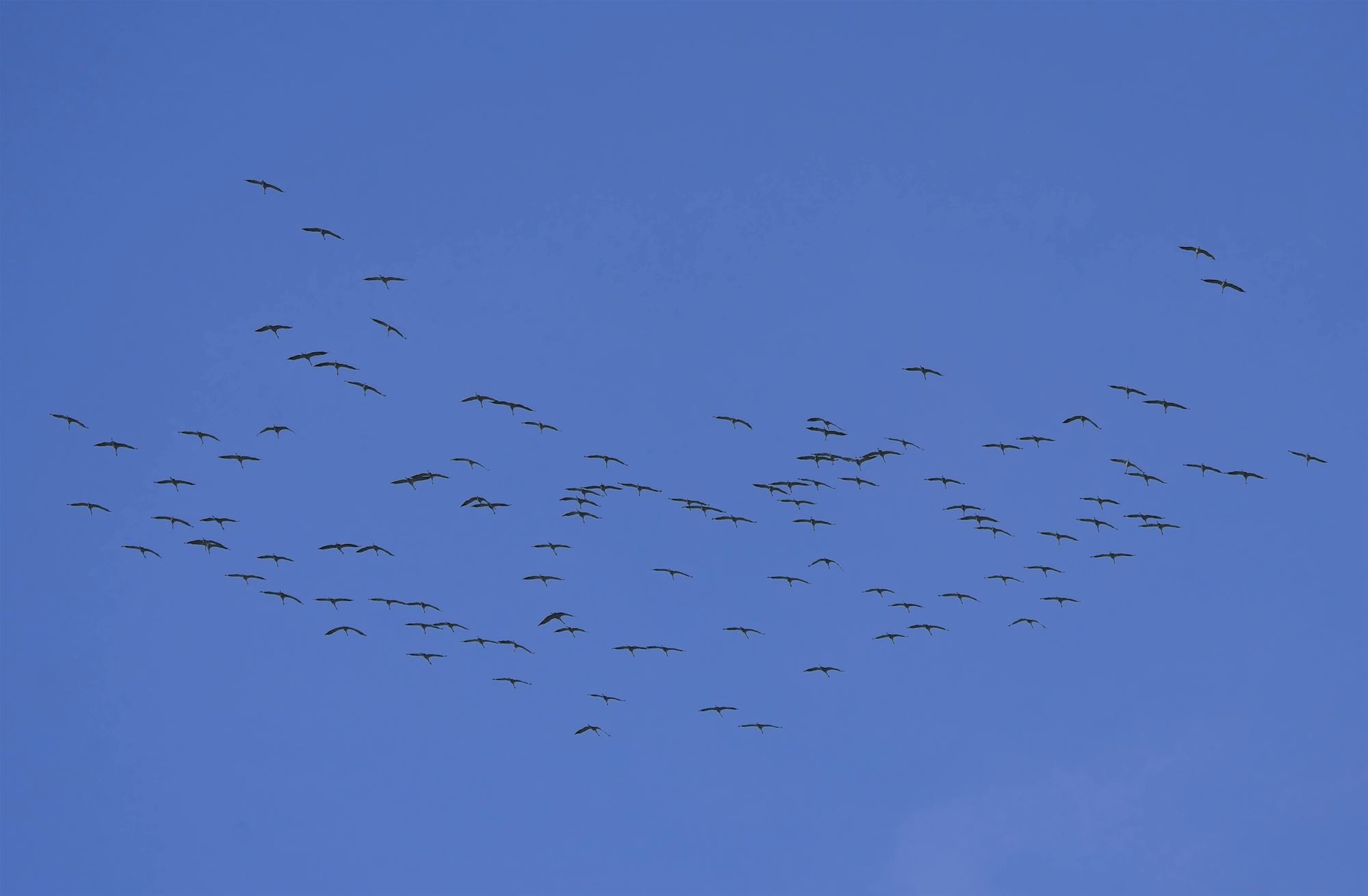 kraanvogels aan hun trek naar het hoge noorden. Opvallend was wel dat ze niet in een v-vorm vlogen, maar allemaal door mekaar. Waren ze even in de war door het mooie weer gisteren? Wie de migratie van de kraanvogels wil volgen, kan dat via deze