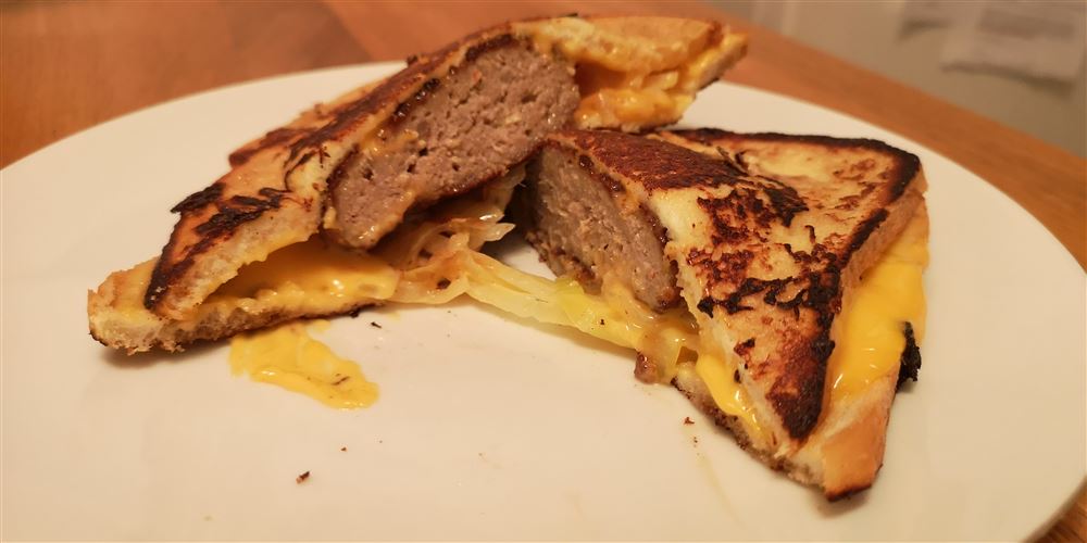 Ondertussen kunnen we het brood beleggen met de smeltkaas op ieder sneetje mag kaas. Als het vlees en de ui klaar zijn mag je deze verdelen op het brood. Dan de andere snee erop zoals een croque maar dan met een hamburger tussen.