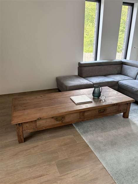 grote teaken salontafel met lades in goede staat. afm 200/85 +/- 40 hoog.