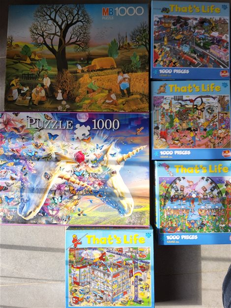 Puzzels 1000 stukjes. In zeer goede staat. Puzzels zijn volledig, enkel de puzzel that's life met de dieren ontbreken 4 stukjes. Prijs per puzzel is 3,5 euro. Prijs onvolledige puzzel is 0,5 euro.