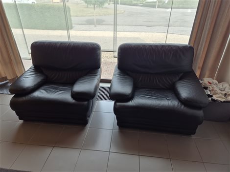 Zwart lederen salon. Bestaat uit: 2-zit en 2x 1-zit. Komt uit een huis waar niet rokers en geen huisdieren wonen. Doe snel een bod. Moet dringend weg! Indien gewenst gratis eiken salontafel