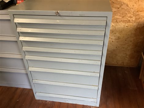 Te koop metalen ladekast te koop met acht verschillende schuiven kast alleen prijs 40 euro kast gevuld met allerlei materialen en machientjes prijs 190 euro .