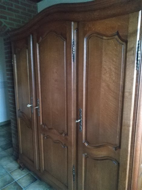 Zeer degelijke kleerkast. 2 deuren als hangkast en 1 deur met schappen en laden. Prijs alleen kast is 150 € Samen met 2 bedden, 2 nachtkastjes en 2 stoelen is de prijs 250 €