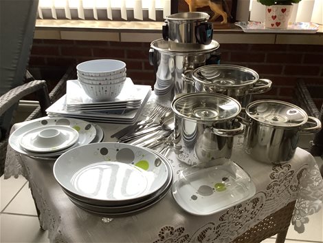 Te koop pannen en schotel set kookpotten ,grote schotels ,dessertschotels ,kommetjes bestek voor vier personen is ideaal voor in de mobilhome of caravan zeer licht materiaal .