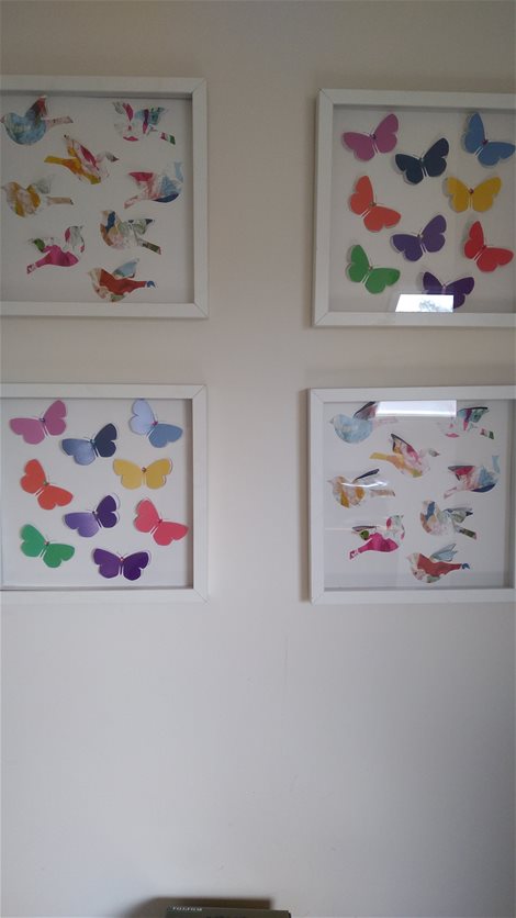4 mooie lijstjes afmetingen 30 x 30 cm met papieren vlinders en vogels. Als nieuw. Samen te koop voor € 15