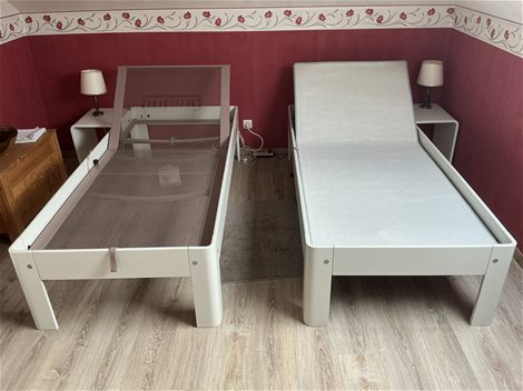2 Auping Auronde bedden, 090 x 2.10 meter, hydraulisch handverstelbaar hoofdeinde en optilbaar voeteneinde. Zonder matras maar wel met matrasbechermer op de spiraal en aanhaakbaar nachttafeltje. 011-634470 Lommel -Kolonie
