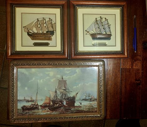 Te koop: 2 3D-schilderijtjes (zie Bic- pen ernaast ter vergelijking grootte) en 1 antieke metalen doos met afbeelding boten.