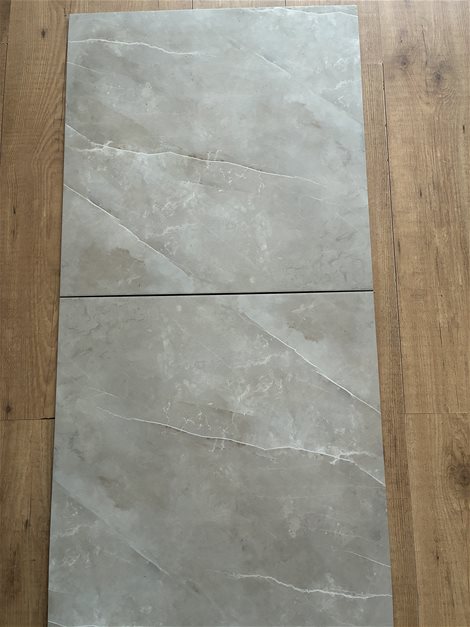 Vloertegels, grijs gemêleerd, gekocht voor woonruimte binnen. Vorstbestendig, dus eventueel ook geschikt voor uitbreiding naar terras. Totaal 69 m2. Nieuw, nog in de verpakking.