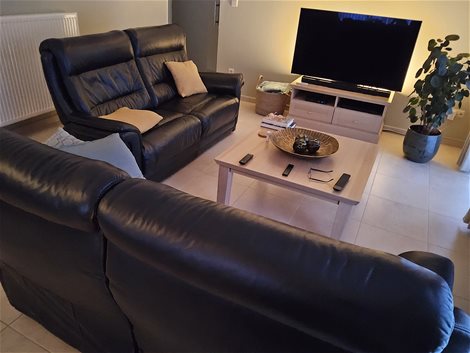 Zwart lederen salon (2 x 2zits, 90x195cm) met licht eiken salontafel (95x95cm) en TV kast (55x100cm).