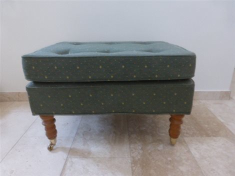 Gecapitonneerde poef met houten poten en zwenkwielen. Kan dienst doen als voetensteun of bijzettafel. Afmetingen: 72 X 52cm Hoogte is 48cm