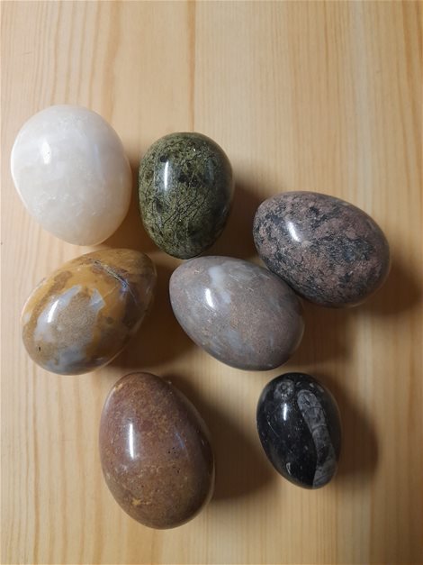 set van 7 stuks eieren uit natuursteen . 7 cm. lang