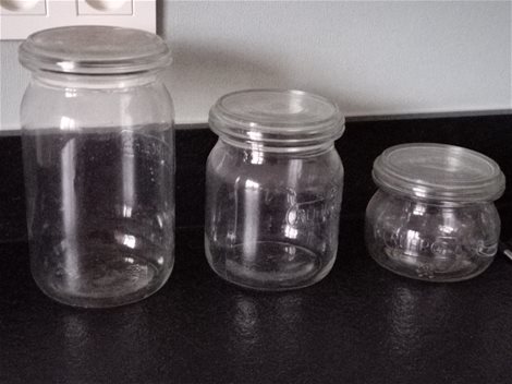 Glazen bokalen : 25 x 1 liter, 10 x 0,5 liter, 7 x 1,5 liter