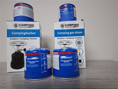 2 nieuwe campingkooktoestellen met 4 gasvullingen te koop 1 gasvulling is 190gr.produkt lengte is 12,20cm,breedte 12,20 cm,hoogte 18,20 cm.brandstof butaan .gasbranders is met klikaansteker.