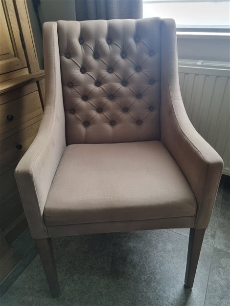 6 eetkamerstoelen in zeer goede staat Taupe kleur behandeld tegen vuil en vlekken. 55 euro per stoel of 300 euro voor de 6