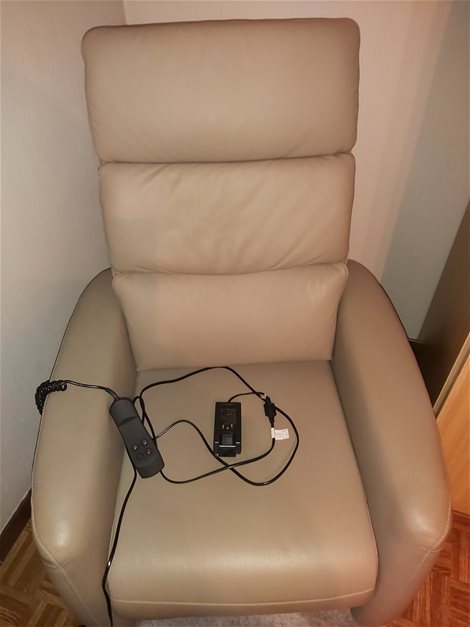 Elektrische relaxzetel met opstap en sta-op functie, hoge rug en zitkussen in harde uitvoering. Beige lederen afwerking. Zeer goed onderhouden en zeer weinig tot niet gebruikt. Staat in een kamer waar geen gebruik van gemaakt wordt. Past perfect in ieder interieur.