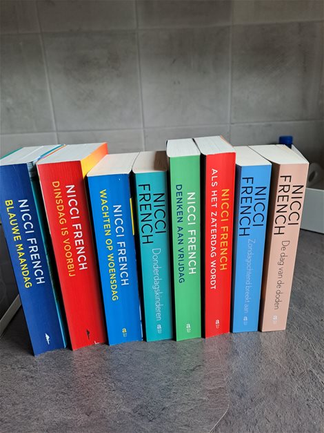 Psychologische thrillerreeks 8delen Nicci French Blauwe maandag,dinsdag is voorbij,Wachten op woensdag enz, nieuw 1xgelezen