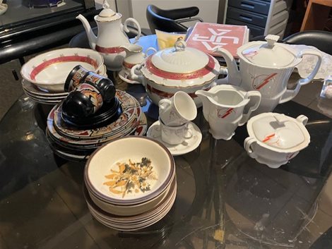 Heel mooi serviesgoed (porselein), bekijk de foto: Rood/wit goudrand; 1: Soepterrine, Koffiepot-melkpotje, kom, 4 diepe borden. 2: Moderne Koffiepot-melk en suiker. 3: 2Tassen-ondertassen. 4: Modern abstract (zwart): 3 tassen, 4 ondertassen, 4 dessert-, 4 platte- en 4 diepe borden.