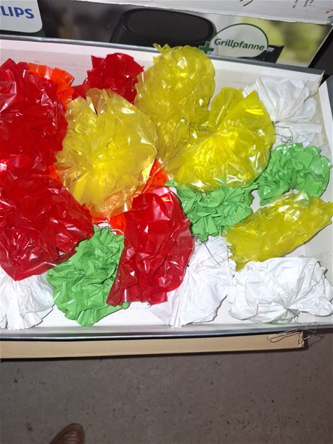 Zelfgemaakte Plastieken bloemen met inoxdraad, dus roest niet voor versiering vb: gouden bruiloft, verjaardag, pensioen….. Verschillende dozen, wit, geel, groen, rood, orange Samen voor 50€