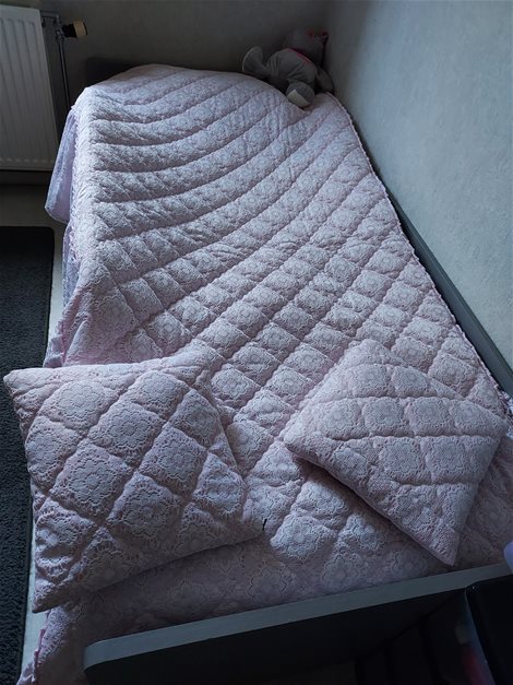 Roze bedsprei in goede staat ,met bijbehorende kussens.