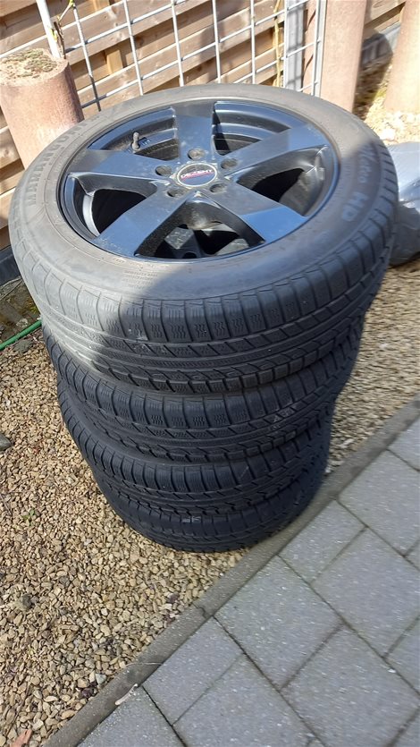 Zwarte velgen zonder schade 17" met winterbanden 225 waarvan 1 slijtage heeft ( merk Marangoni) de andere 3banden zijn 95% oké;
