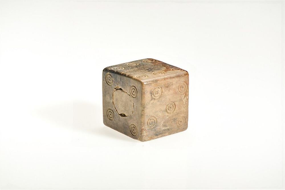 eeeeeeuwen geleden dienden. Zoals deze dobbelsteen, volledig uit mergpijp vervaardigd, met gegraveerde ogen. Hij dateert uit de eerste eeuw na Christus.