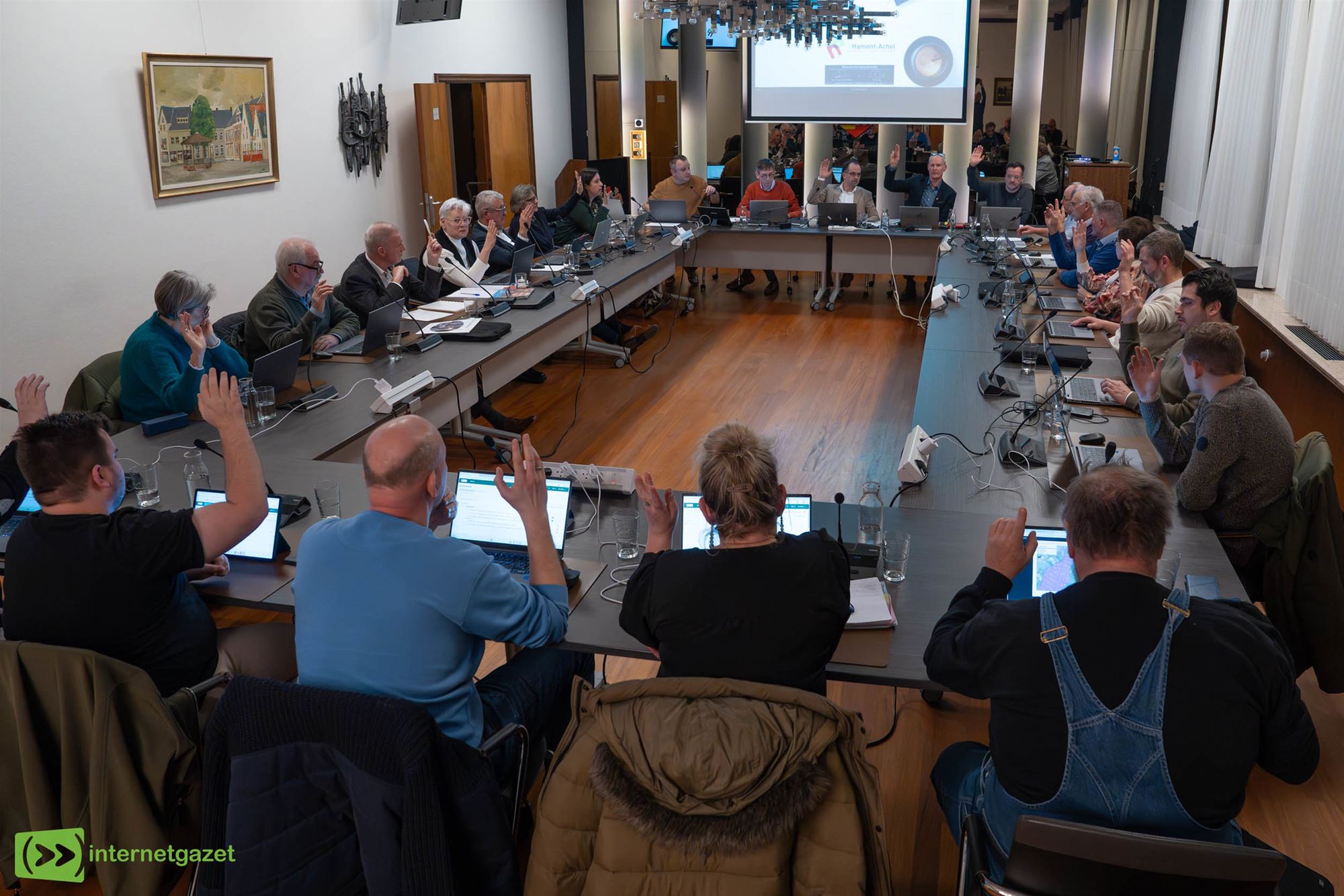 Theo Schuurmans kwam even tussen: “Op het plan voor het stadhuis staat: aan te leggen met recup-betonklinkers”. Hij vulde aan: “Als je een klein beetje inspanning doet, dan zie je dat een heel aantal zaken er wel degelijk in zitten, het is een bijzonder mooi project, we moeten daar allemaal fier op zijn. Er zullen misschien wel wat details bij zijn die niet goed zijn, maar ik was er van onder de indruk. Dit wordt het paradepaardje van de stad.”
