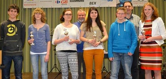 Voor de jeugdafdeling waren dat Bo Govers en Pleun Kuipers van Budel samen op multi-percussion en Ruben van der Thiel van Budel op snare drum, Esmee Hegge voor Budel op hoorn en Esther de Werdt van Budel op klarinet. In derde afdeling waren de laureaten Laura Kees van Budel-Schoot op hobo, Stef Manders van Hamont op bariton en Roel Slegers op multi percussion. In de tweede afdeling, waar het onderscheid tussen hout- en koperinstrument en slagwerk niet meer gemaakt werd, waren de laureaten Ward Habraken en Amber Manders van Hamont samen op klarinet. In de eerste afdeling werd als laureaat Renée Compen van Budel op alt saxofoon aangewezen. In de afdeling uitmuntend was de laureaat Loes Derks van Budel op klarinet. In de ere-afdeling ten slotte werd Lisa Rooyakkers van Budel laureaat op klarinet. Op bijgaande foto treft u de vijf laatste laureaten aan van de deelnemers van zondag, aangevuld met Stef Manders die op zaterdag zijn huldiging moest missen...