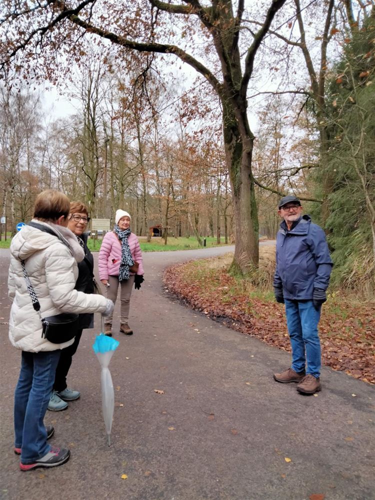jaarlijkse najaarswandeling. Het was een wat druilerige ochtend, maar dat kon de goede sfeer niet drukken. Eén deelnemer miste de start, maar sloot later opnieuw aan in de Hamont-Achelse bossen – tot grote hilariteit van de groep.