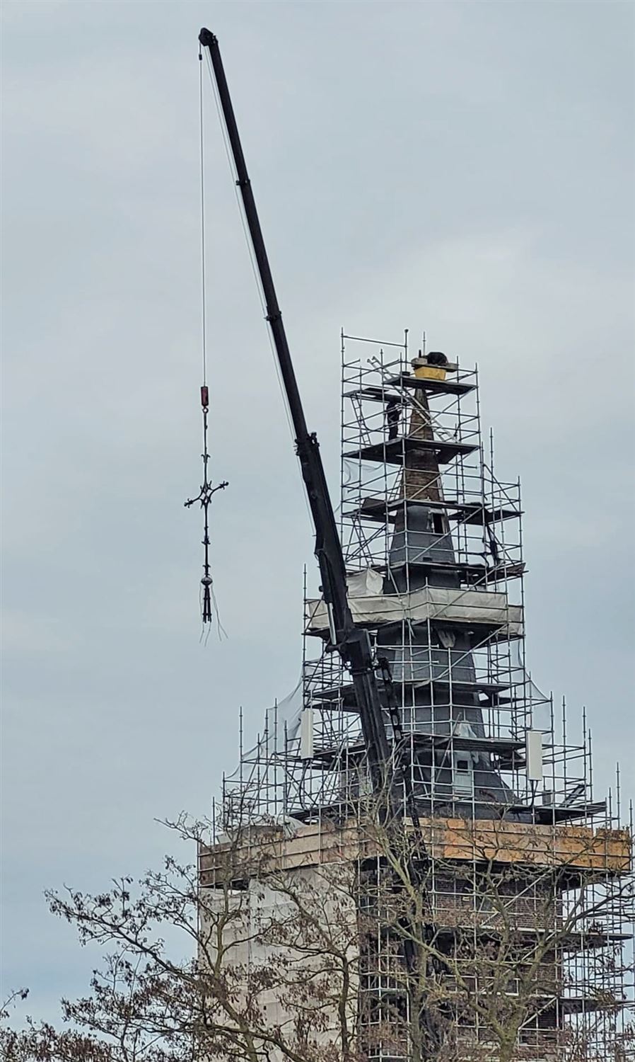 Daar zal Pasen dit jaar zonder kruis én haan op de kerktoren gevierd moeten worden. René Winters liet weten dat beide recent werden verwijderd. Marc Claes maakte de foto van het weghalen van het kruis.