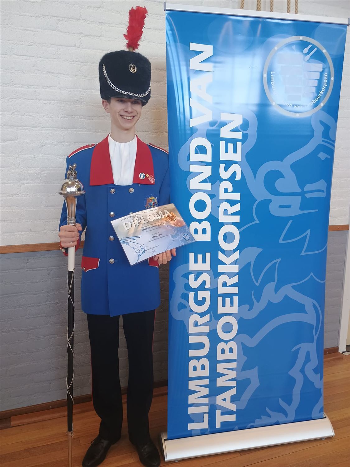 Een aantal maanden geleden viel er een brief in de bus met de uitnodiging om de cursus voor Tamboer Maître te volgen. In zes intensieve zaterdagen kreeg hij alle instructies die nodig zijn om een fanfare door de straten te leiden, als het even kan nog netjes in de maat. Anne Vanhertum, de Tamboer Maître van Kempenbloei, hielp hem verder om alles tot in de perfectie te oefenen. Vandaag behaalde hij als jongste deelnemer zijn examen met een schitterende score van 8.7!