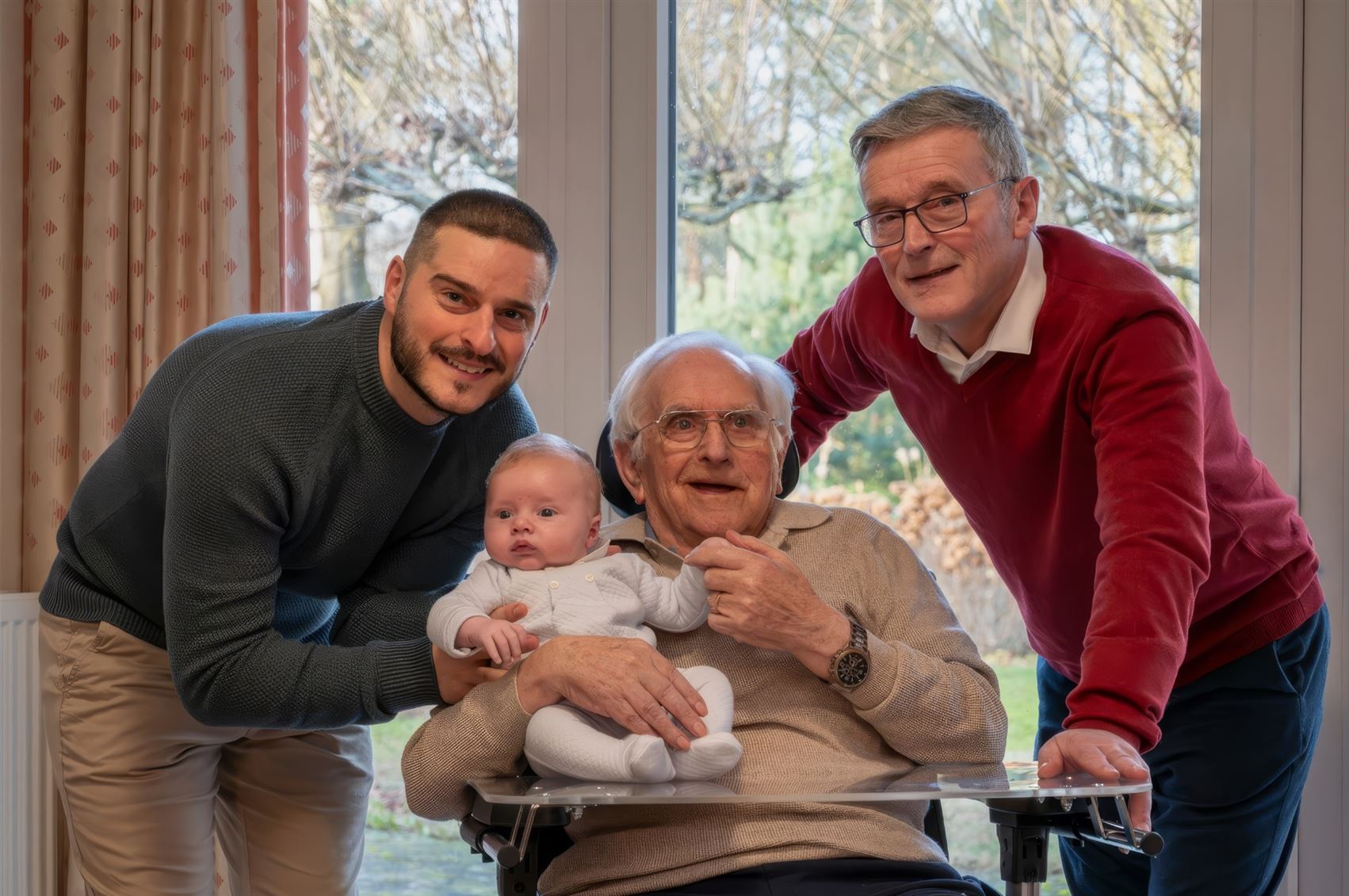Jef (98) staan vier generaties mooi op een rij. Een zeldzame en warme gebeurtenis waar de familie dan ook bijzonder trots op is.