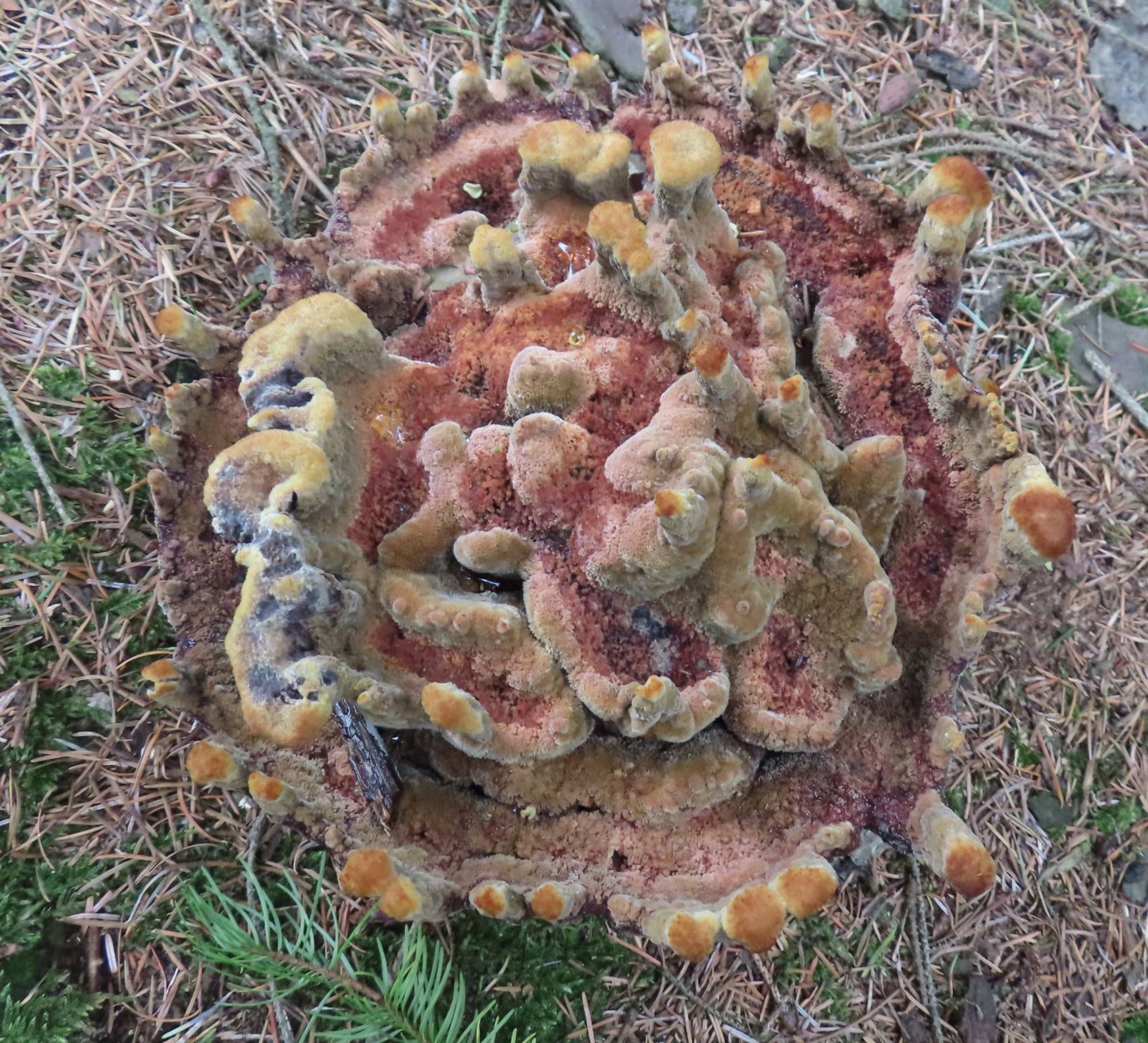 De dennenvoetzwam (Phaeolus schweinitzii) is een opvallende verschijning: jong heeft hij een fluweelachtig, geelbruin hoedoppervlak dat later donkerbruin en ruw wordt. De rand blijft vaak lichter van kleur, waardoor hij goed opvalt tussen de gevallen naalden.