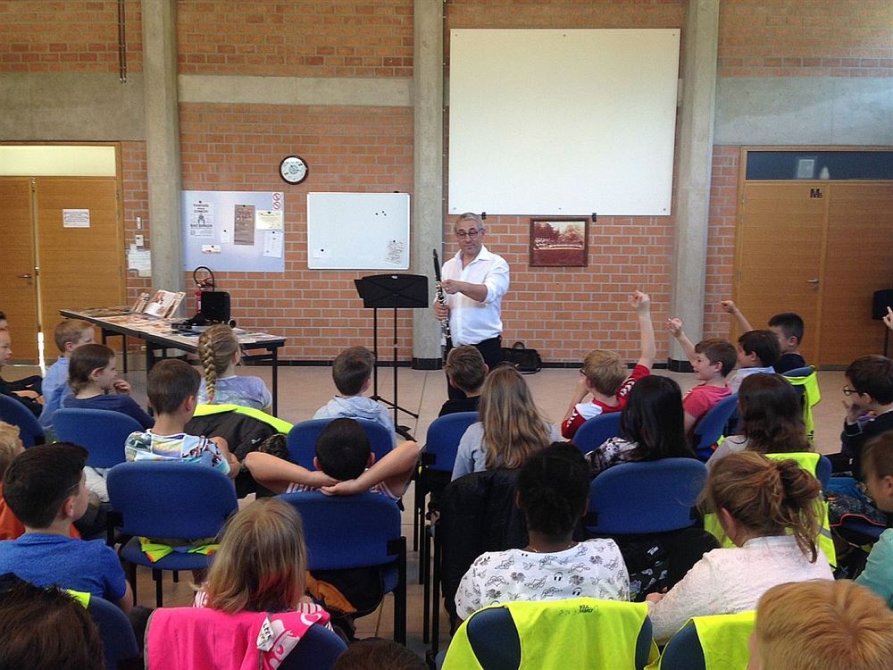 Klarinetdocent Kris Vuylsteke van de Kunstacademie Noord-Limburg reserveerde een groot deel van de dag voor de jongens en meisjes van het derde leerjaar van de vier lagere scholen in de gemeente. Het was voor hen een aangename ontmoeting, en een boeiende kennismaking met dit prachtige instrument.