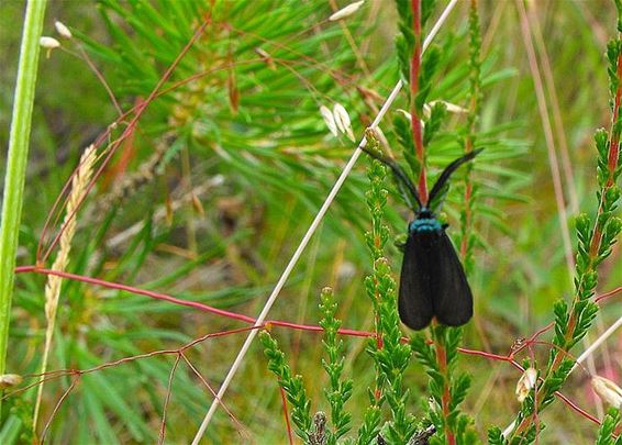 bruin metaalvlindertje, een dagactief nachtvlindertje en een zeldzaamheid, dat de laatste jaren dankzij het heidebeheer in Bosland in aantal toeneemt. De bijna zwarte kleur is zowat uniek bij onze vlinders. Let ook op de afgeronde vleugels, zo typisch voor deze soort.