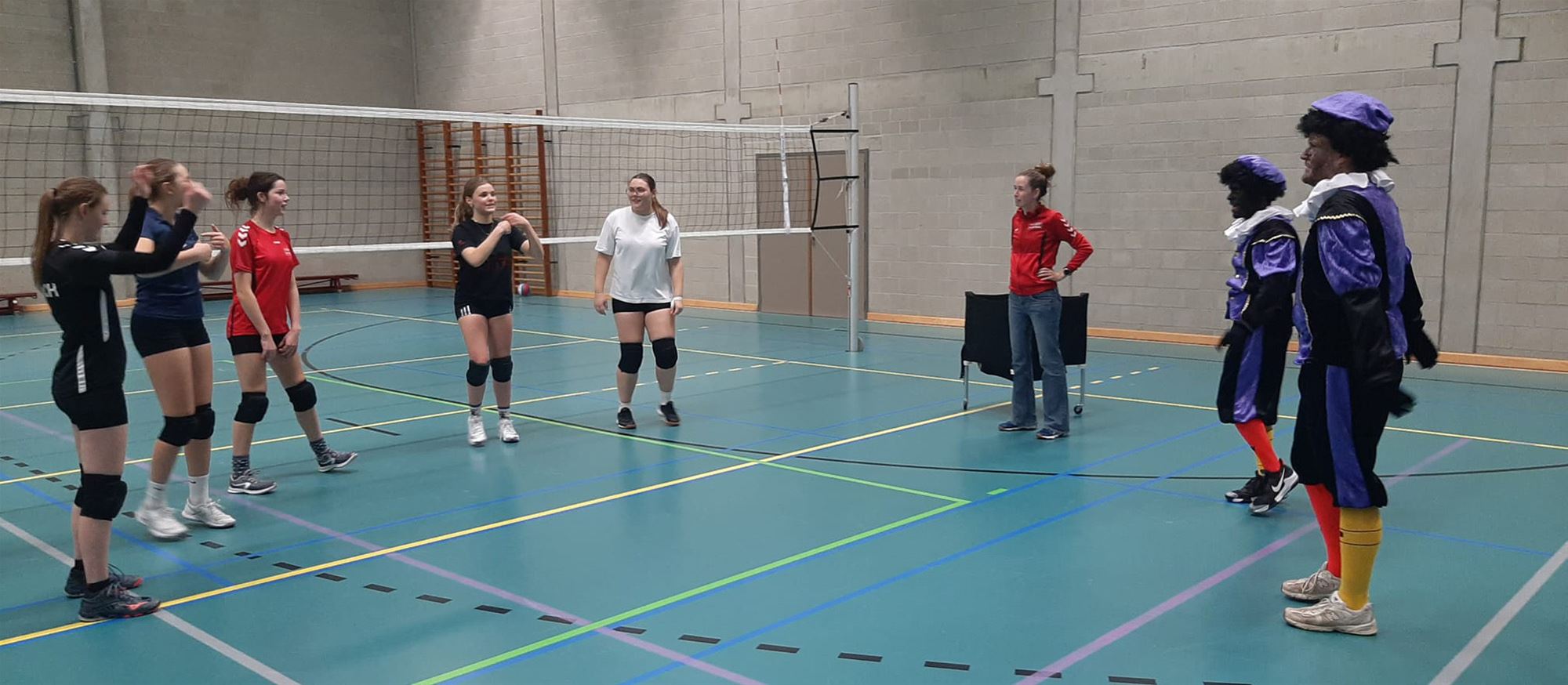 De twee Pieten gaven een sportieve demonstratie, dartelden tussen de volleybalnetten door en haalden allerlei acrobatische capriolen uit. Elke speler kreeg bovendien een lekkere traktatie mee naar huis. Ook de trainers en trainsters werden niet vergeten: voor hen hadden de Pieten eveneens iets lekkers meegebracht.