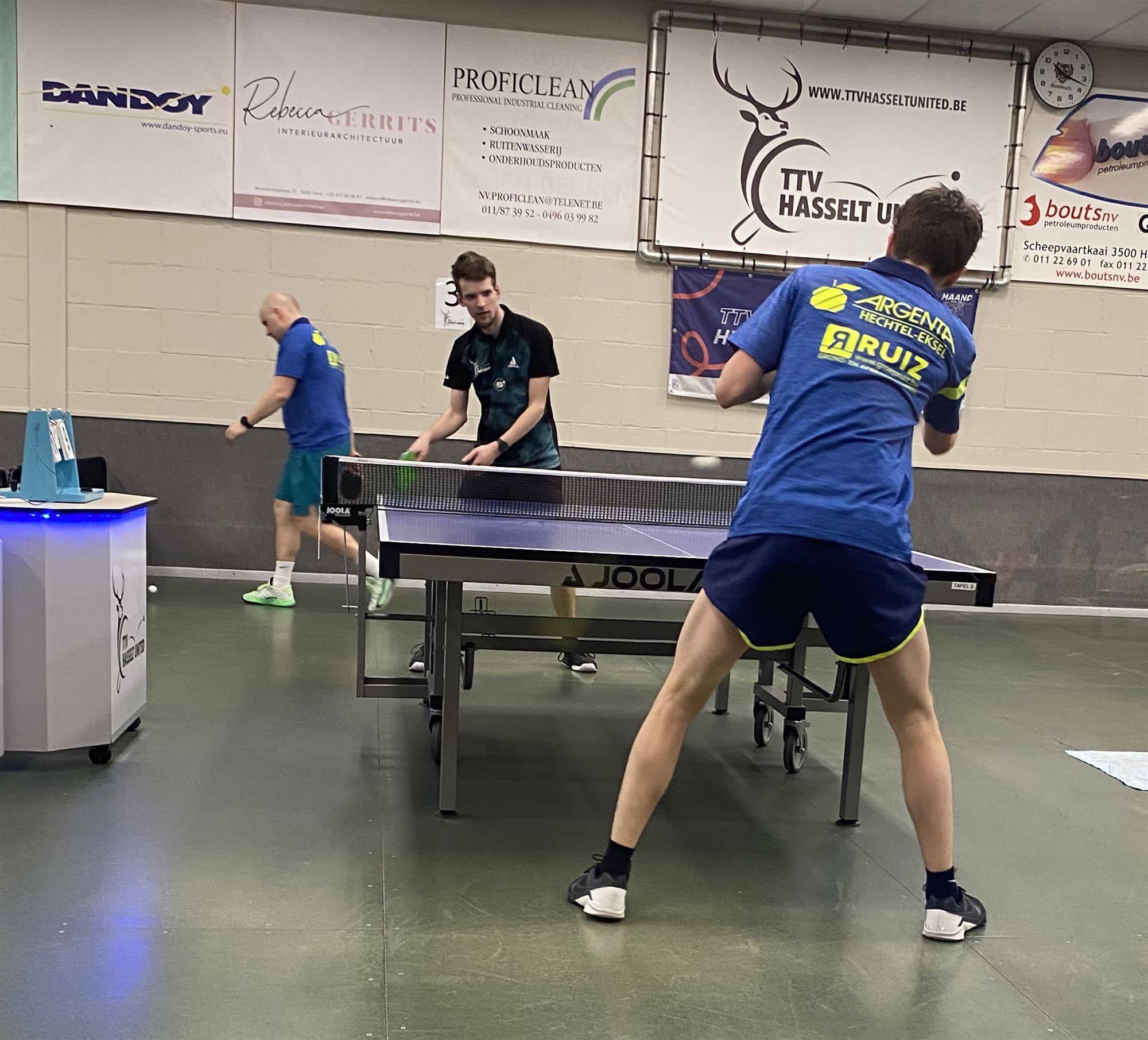 De A-ploeg trok naar Hasselt United en kende een sterke start. Na een 1-5 voorsprong hield het team lange tijd een marge van twee matchen aan. Dankzij Jorne Raymakers was het gelijkspel al verzekerd. Jens en Johan kregen daarna nog de kans om het voordeel naar hun kant te trekken, maar dat lukte net niet. Johan verloor in vier sets en Jens ging in de vijfde en beslissende set nipt onderuit met 12-10. Het werd uiteindelijk 8-8, wat opnieuw een degelijk resultaat opleverde.