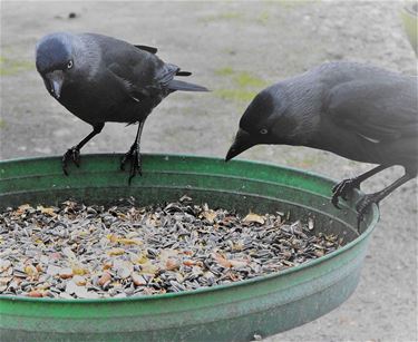 kauwen bezoeken de voedertafel, al is er veel geduld nodig om ze zover te krijgen. Kauwen zijn zeer achterdochtige vogels die tijd nodig hebben om aan iets te wennen.